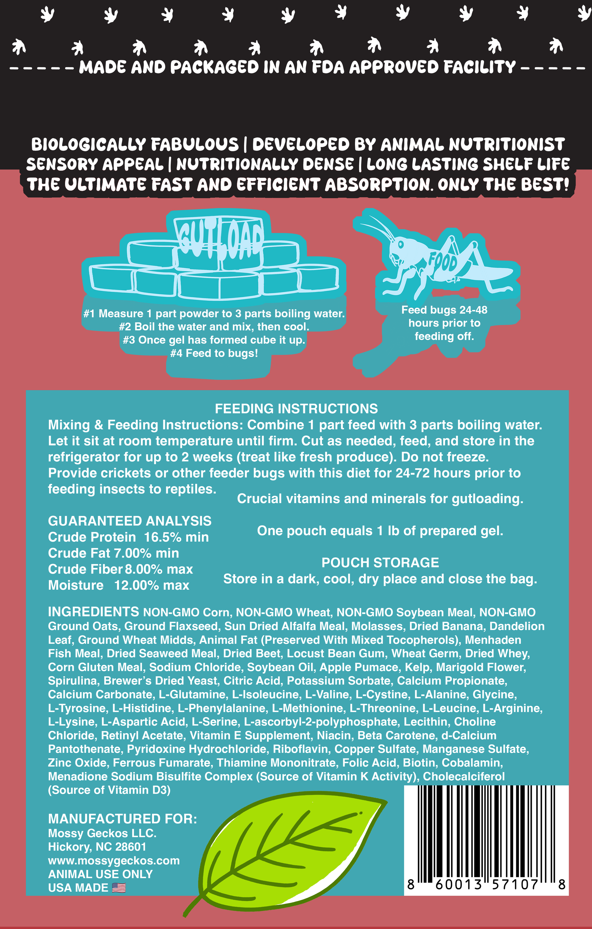 FEEDING INSTRUCTIONS Mixing & Feeding Instructions: Combine 1 part feed with 3 parts boiling water. Let it sit at room temperature until firm. Cut as needed, feed, and store in the refrigerator for up to 2 weeks (treat like fresh produce). Do not freeze. Provide crickets or other feeder bugs with this diet for 24-72 hours prior to feeding insects to reptiles.