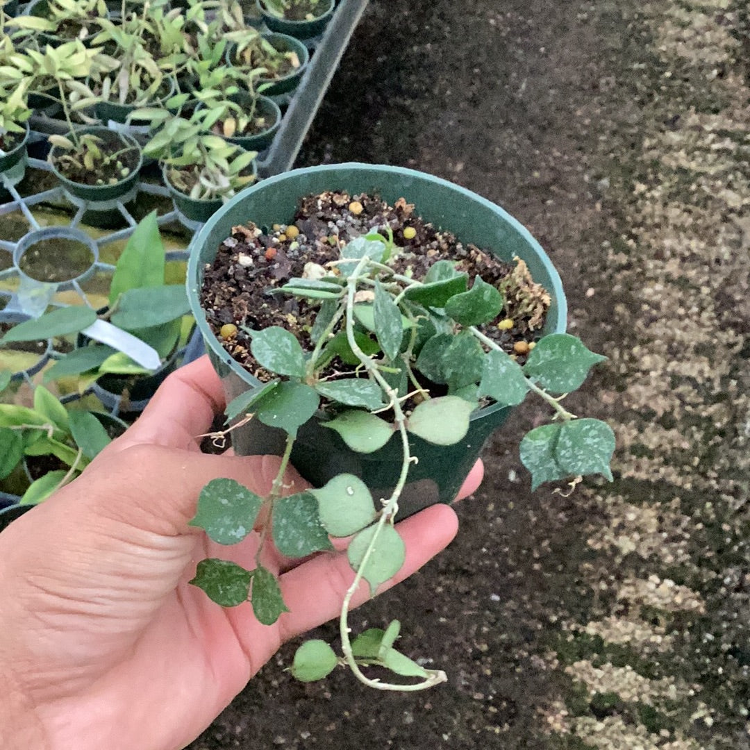 It is a charming species of Hoya with small, succulent-like leaves adorned with silver speckles. Its trailing vines and clusters of star-shaped, white flowers with pink centers make it a delightful addition to any plant collection, thriving in bright, indirect light conditions.